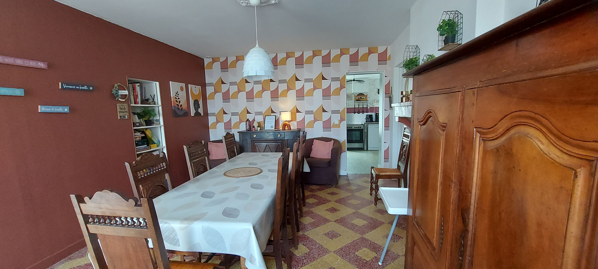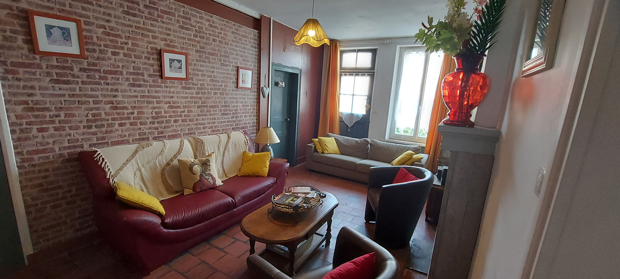 Banquette vrai lit de 90, canapé 3 places table basse. TV.
