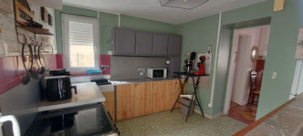 cuisinière électrique avec four, réfrigérateur avec congélateur, lave vaisselle, micro ondes, cafetière Senseo, cafetière philtre, grille-pain.